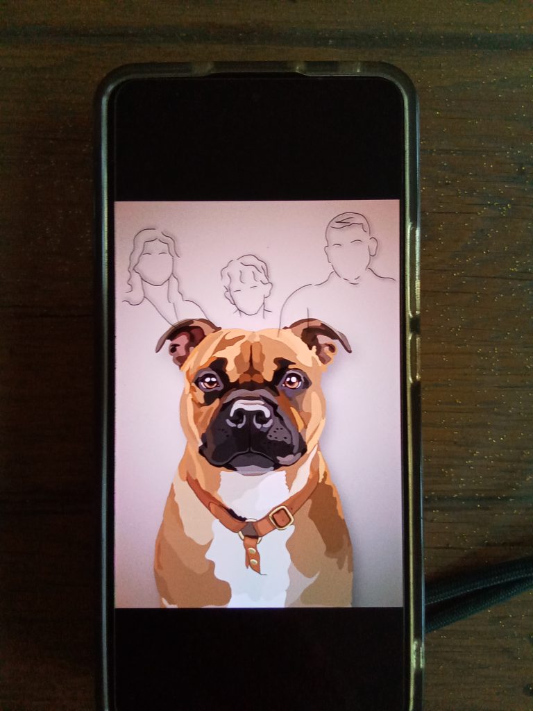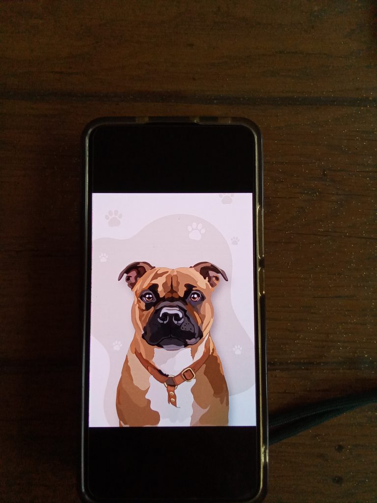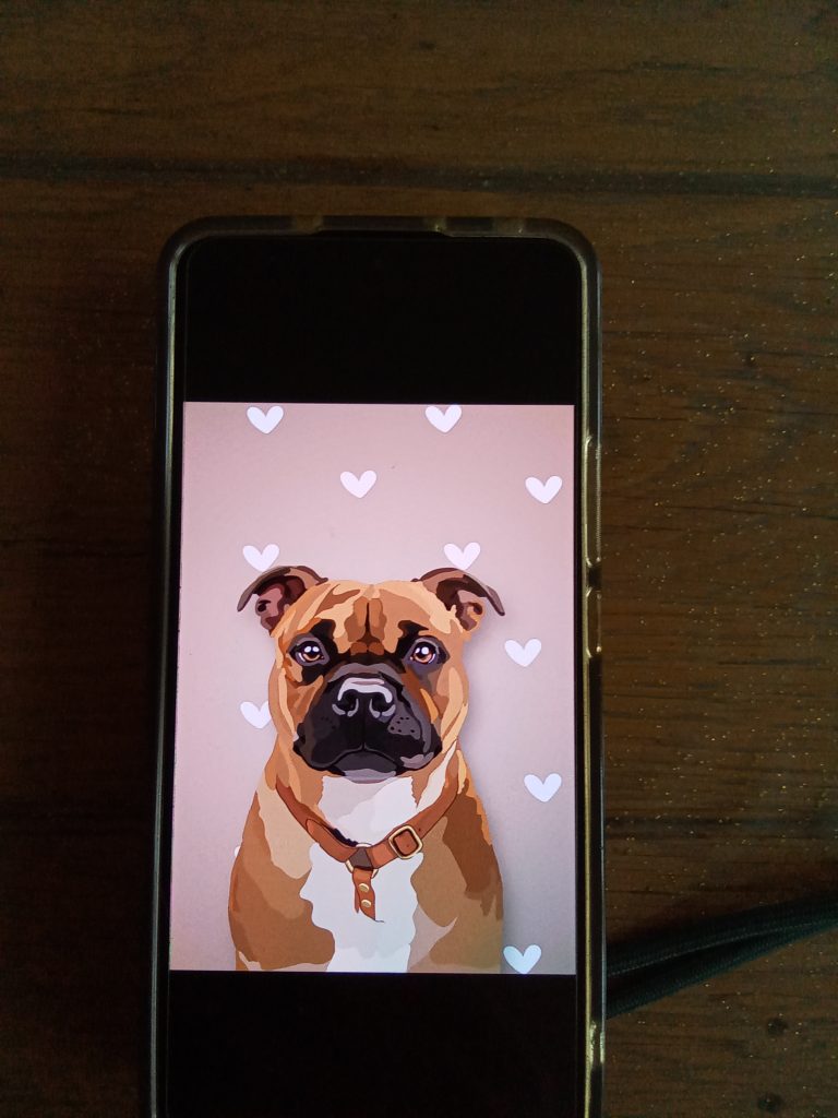 Magnifique portrait de mon chien vegasstaffy. Je recommence cette créatrice qui fait un travail à la main et très à l’écoute lors de la personnalisation.